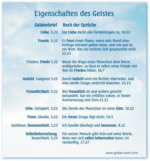 Hallo, Jede Woche wird ein bestimmtes Thema betrachtet um deinen persönlichen Glauben zu stärken. Das Thema diese Woche ist ... IM VERGLEICHIm alten und neuen TestamentJesus zitierte maßgebende Vorschriften die unser Leben erleichtern können wenn wir sie einhalten.Unser ganzes Benehmen soll in seiner Gleichnis heranwachsen. Als Christen sind wir beansprucht Jesus zu vertreten - das was er getan hat ist nun unsere Aufgabe und Verantwortung geworden. Jesus Christus ist derselbe, gestern (im alten Testament), und heute (im neuen Testament) und auch in Ewigkeit, Hebräer 13,8. Seine Eigenschaften, Die Frucht des Geistes, z.B., Galater 5,22-23 stehen gleich mit dem Inhalt des alten Testament als unsere Musterbeispiele. Neun Eigenschaften des GeistesWeiterhin sagte der HERR, Denn was von mir [geschrieben steht], das geht in Erfüllung, Lukas 22,37 (SB2000). Im Galaterbrief 5,22-23 sind seine Eigenschaften ausgelegt die wir uns aneignen sollen.